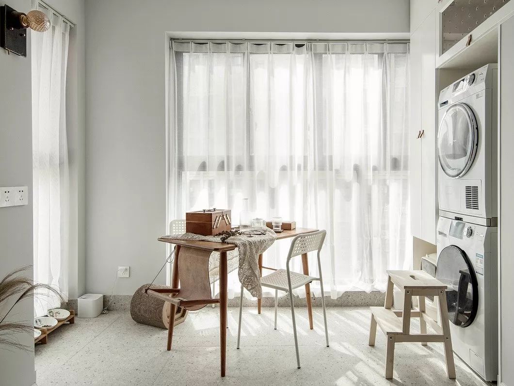 家装设计阳台装修效果图,因为日本留学留下的生活习惯,又由于有独立烘干机的存在,客厅的阳台舍弃了晒衣的功能,进一步作为客厅空间的扩充,室内装修设计增大空间感也为猫咪提供了更宽阔的空间,同时这里也是一家六口的餐饮空间,餐桌选择了尺寸较小的轻盈款,很容易移动,给喜欢做手工的女主人提供了一块完美的日光小房,充足的阳光,身旁傍着四只主子.....